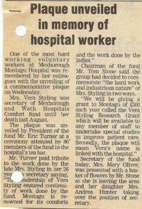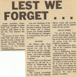 Mr Eric Turner always used his many influential contacts to obtain recognition and support for the many voluntary services within the Montagu Hospital. Former Montagu Hospital secretary, Mr Stanley Wildgoose was elected president; Mr Wildgoose.who came as secretary in 1949, said he would undertake to carry on the high standards of his predecessors.